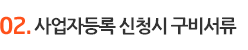 »ç¾÷ÀÚµî·ÏÀº »ç¾÷À» ½ÃÀÛÇÑ ³¯·ÎºÎÅÍ 20ÀÏ ¾È¿¡ ±¸ºñ¼­·ù¸¦ °®Ãß¾î °üÇÒ ¼¼¹«¼­ ³³¼¼¼­ºñ½º¼¾ÅÍ¿¡ ½ÅûÀ» ÇÏ¼Å¾ß ÇÕ´Ï´Ù.