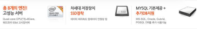 ÃÑ 8°³ÀÇ ¿£Áø! °í¼º´É ¼¹ö Quad-Core CPU(*2)=8Core,ÄõµåÄÚ¾î64bit °í»ç¾ç¼¹ö ¸®´ª½º ±â¹Ý À¥È£½ºÆÃÀ¸·Î Æø¹ßÀûÀÎ »ç¾çÀÇ °í¼º´É ¼¹ö¿Í Â÷¼¼´ë ±â¼ú·Î ´õ¿í ºü¸£°í ¾ÈÁ¤ÀûÀΠȣ½ºÆÃÀ» Á¦°øÇÕ´Ï´Ù. ÄõµåÄõ¾î Quad-Core ¶õ? 1°³ÀÇ CPU¿¡ 4°³ÀÇ Äھ žÀçµÈ °ÍÀ¸·Î, ¾Æ¿ìÅä¹Ý È£½ºÆÃ ¼¹ö 1´ë¿¡ CPU°¡ 2°³·Î ±¸¼ºµÇ¾î, ÃÑ 8°³ÀÇ CPU ó¸® ´É·ÂÀ» °¡Áö°í ÀÖ´Â Æø¹ßÀûÀÎ »ç¾çÀÔ´Ï´Ù.
