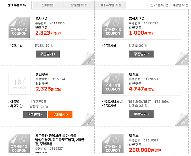 ÀüüÀû¿ëÄíÆù, °³º°»óǰº°, Ä«Å×°í¸®º°, ½Å±Ôµî·Ï, ¸¶°¨Àϼø ÄíÆùÀ» ±¸ºÐÇÏ¿© Ãâ·ÂÀÌ °¡´ÉÇϸç ÄíÆù´Ù¿î·Îµå ¹× ¹Ù·Î±¸¸Å°¡ °¡´ÉÇÕ´Ï´Ù.